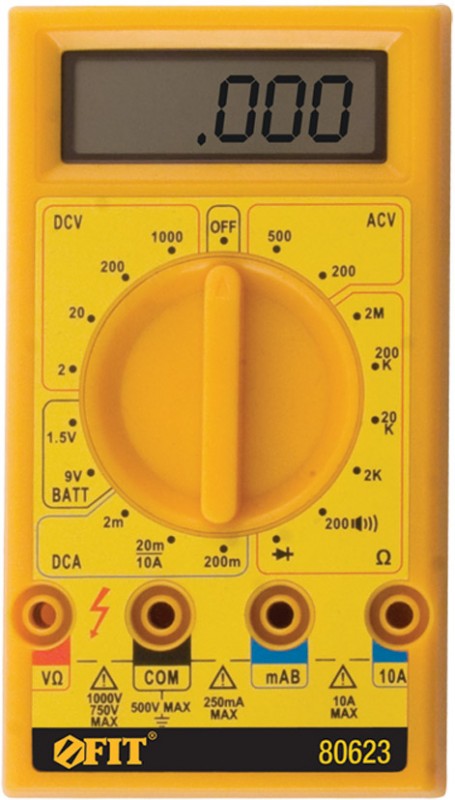 Мультиметр FIT EM5308B 80623 представляет собой инструмент, который предназначен для быстрого и удобного измерения параметров сопротивления, постоянного тока, постоянного и переменного напряжения. Мультиметр оборудован большим экраном, на котором отображаются все получаемые показания. При активном режиме проверки целостности цепи включается звуковая индикация — звуковой сигнал. Задняя крышка оснащена подставкой для обеспечения удобства при пользовании. Мультиметр мобильный, работает от батареи 9 В. В конструкции имеется также индикация разряда батареи.