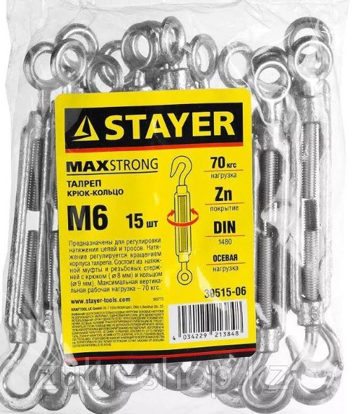 Талреп DIN 1480, крюк-кольцо, М6, 15 шт, оцинкованный, STAYER