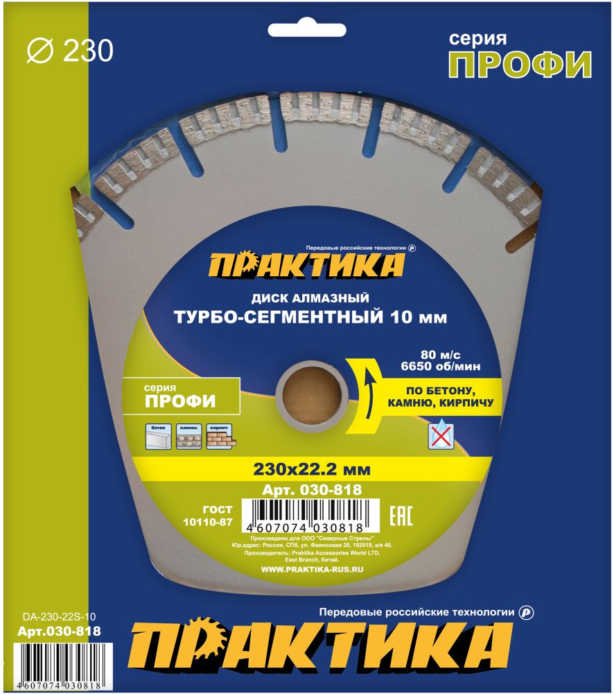 - Алмазный диск ПРАКТИКА 230 х 22 мм сегмент 10 мм турбосегментный